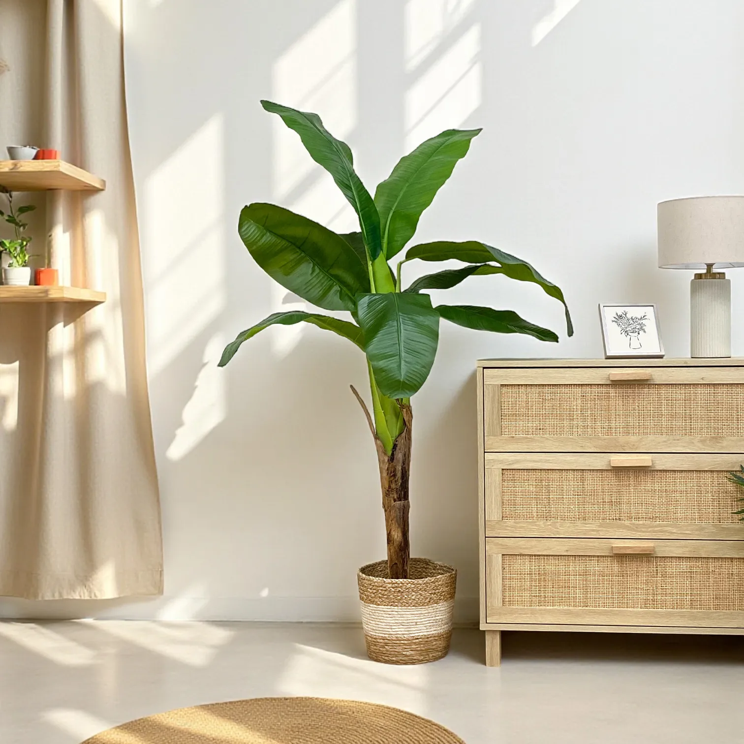 Contrairement aux plantes naturelles, ce bananier artificiel déco ne demande aucun soin. Il conserve sa beauté sans arrosage, sans taille et sans risque de jaunissement. Un simple dépoussiérage occasionnel suffit pour préserver son éclat.