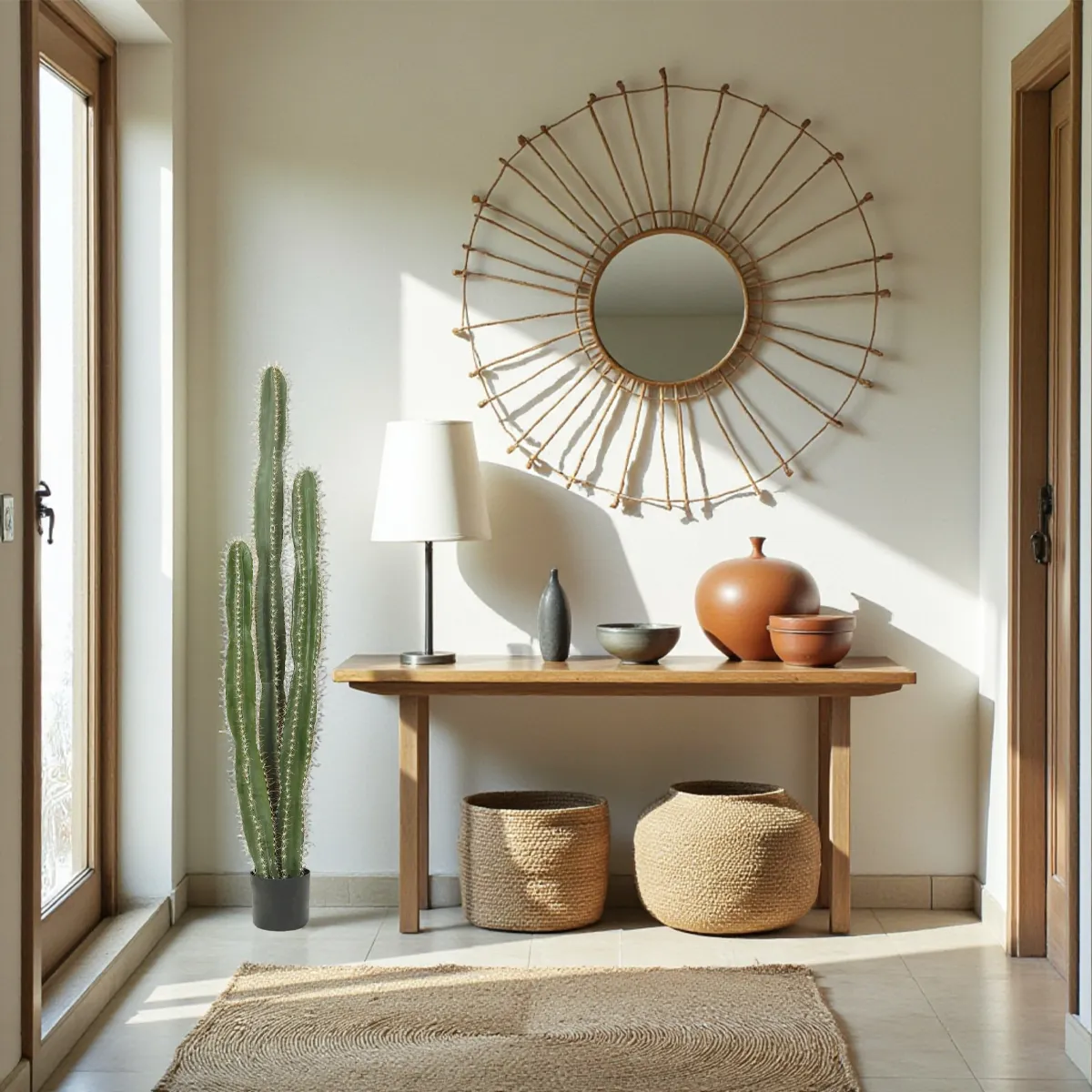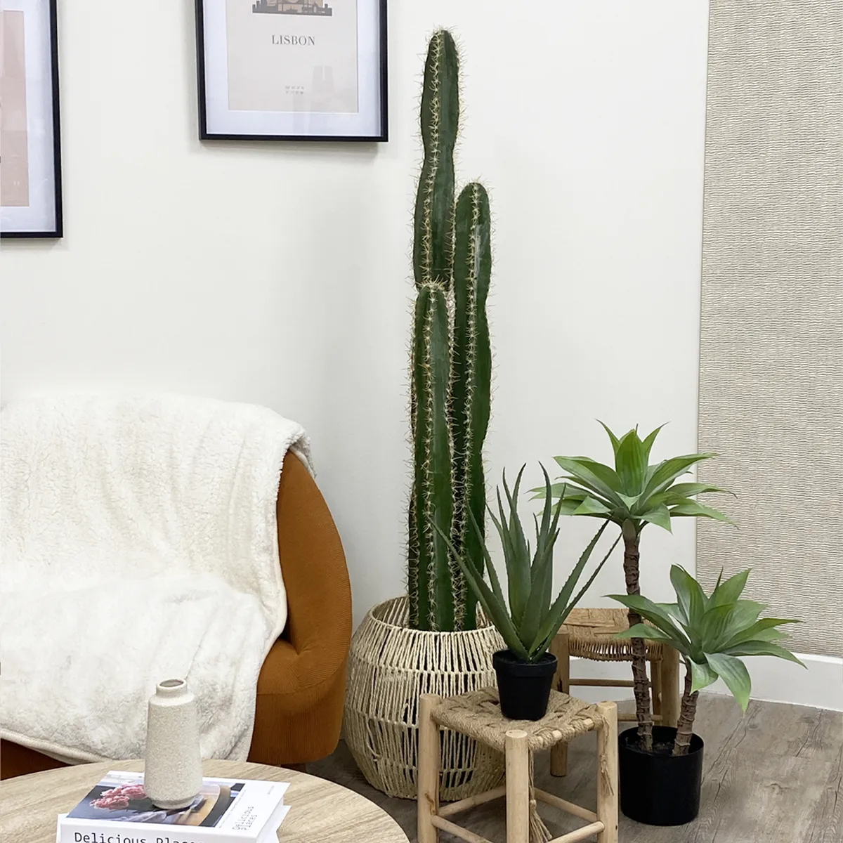 Placez votre cactus directement au sol dans un joli cache-pot en osier, en céramique ou en métal pour accentuer son impact visuel. Associez-le à d’autres plantes artificielles – comme un monstera, un palmier, ou une fougère tombante – pour composer une ambiance végétale complète et tendance.