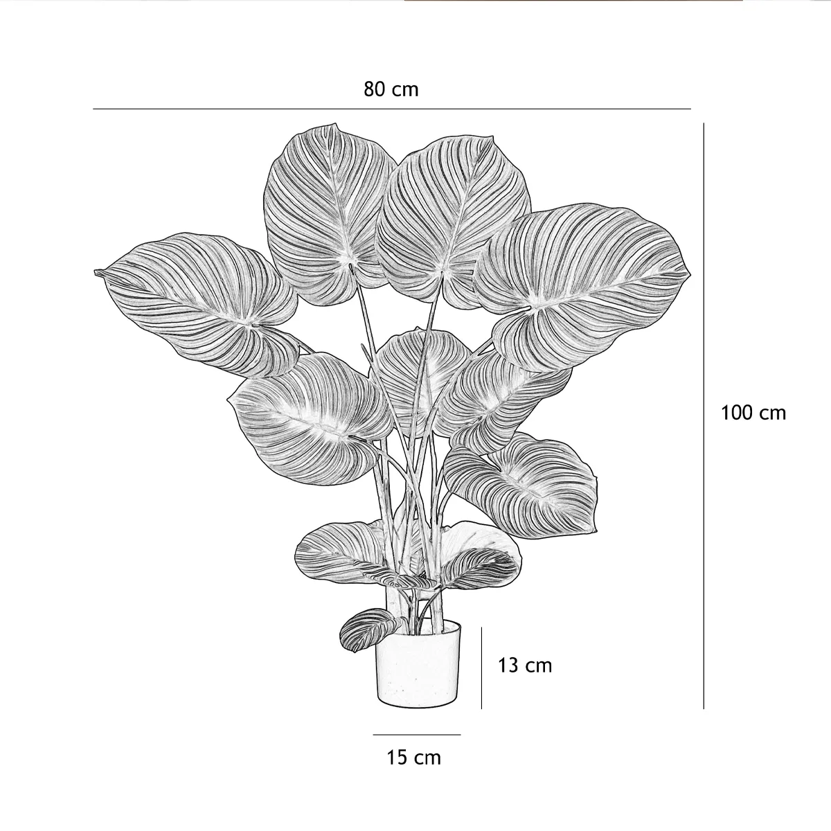 Reproduction fidèle du calathea orbifolia, notre plante artificielle calathea 100 cm se distingue par ses feuilles larges en éventail, ses nervures délicates et ses nuances subtiles de vert. Chaque détail a été travaillé pour restituer l’apparence et la texture d’une plante naturelle. Ainsi, même les passionnés de botanique seront bluffés par son réalisme.