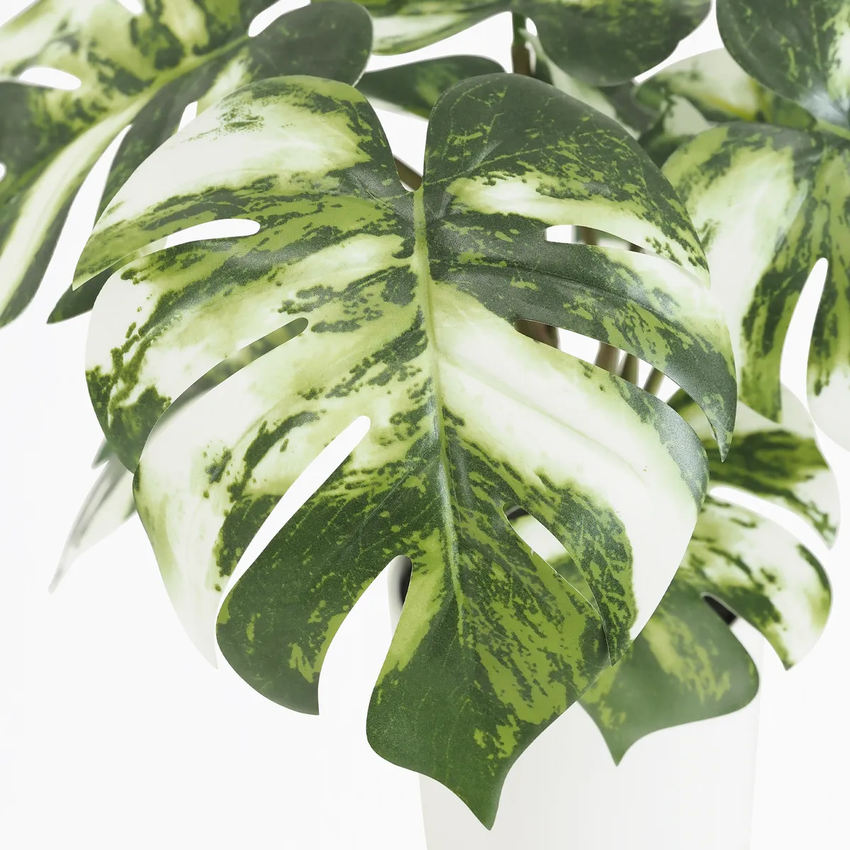 Ce faux monstera variegata séduit par ses feuilles uniques, mêlant subtilement le vert et le blanc. Chaque nervure et chaque découpe sont minutieusement travaillées pour imiter l’apparence du monstera variegata naturel. Le rendu visuel est saisissant et bluffant de réalisme, même de près.