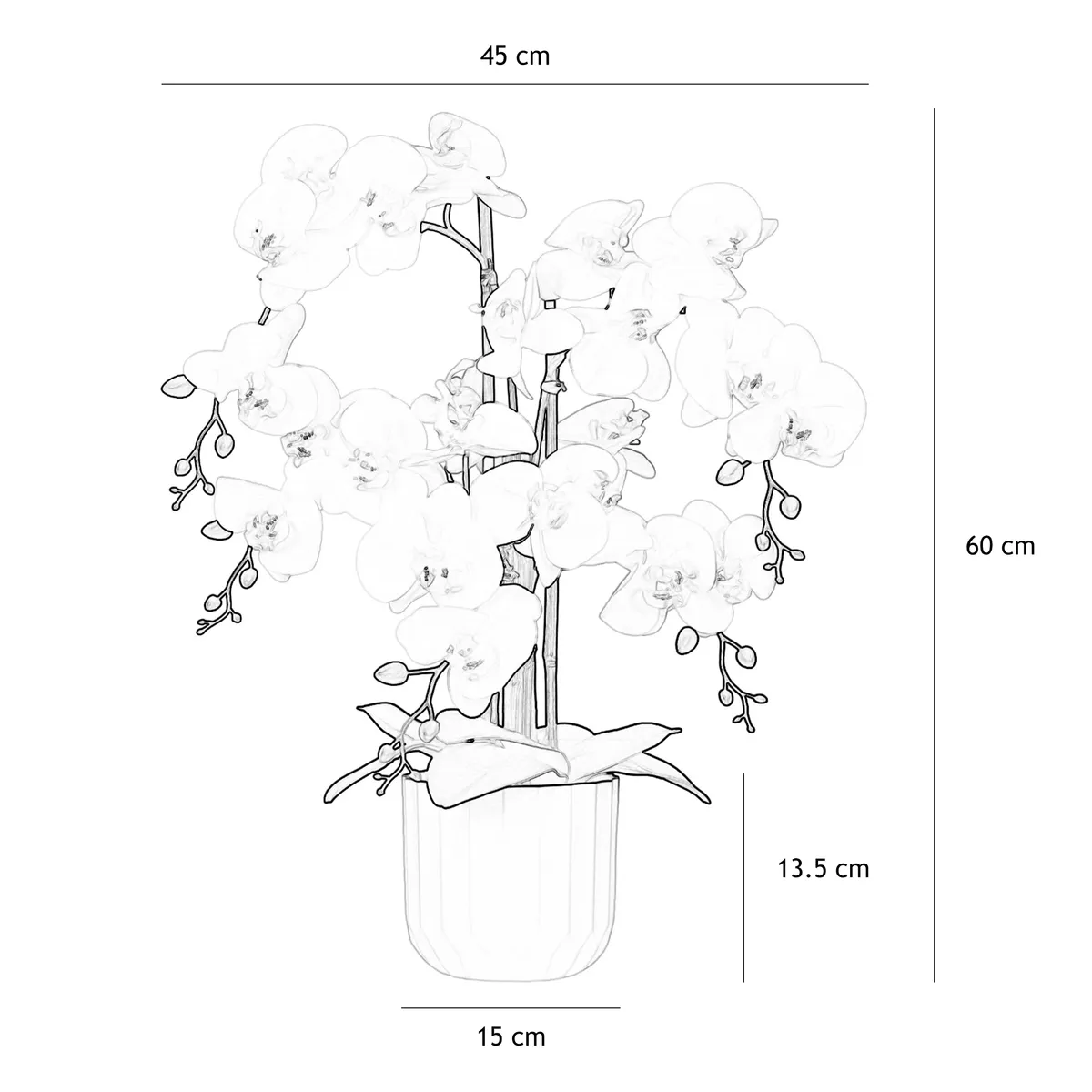 Grâce à ses dimensions généreuses (60 cm de haut), cette orchidée artificielle haut de gamme trouve naturellement sa place dans toutes les pièces : sur une table basse, une console d’entrée, un comptoir, ou encore un meuble de salle de bain. Elle attire le regard sans encombrer l’espace.