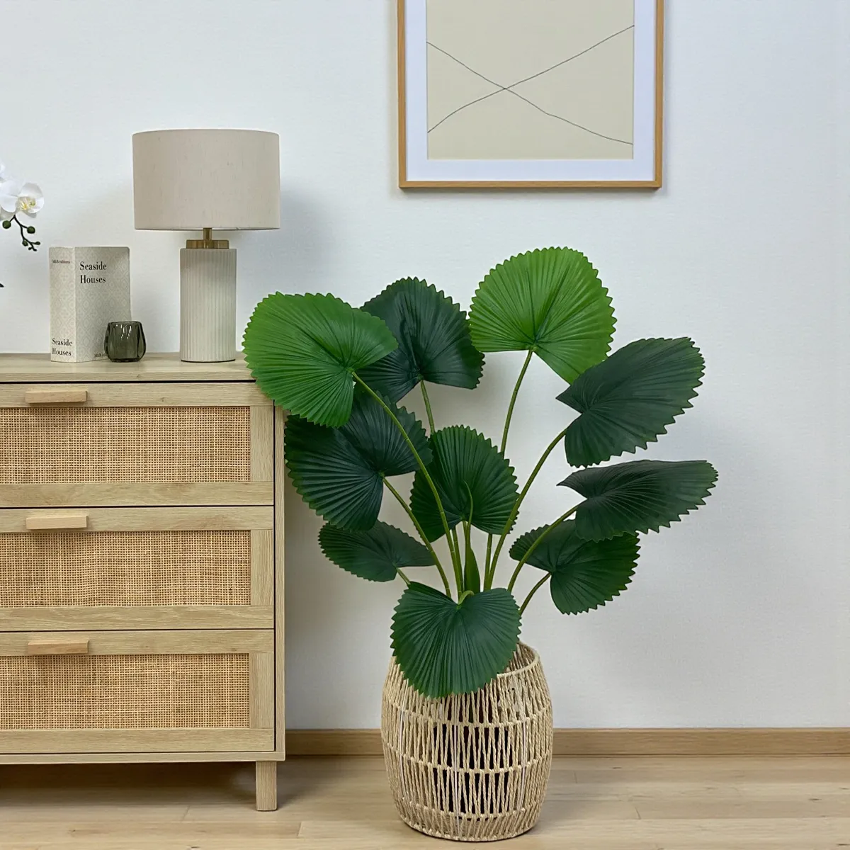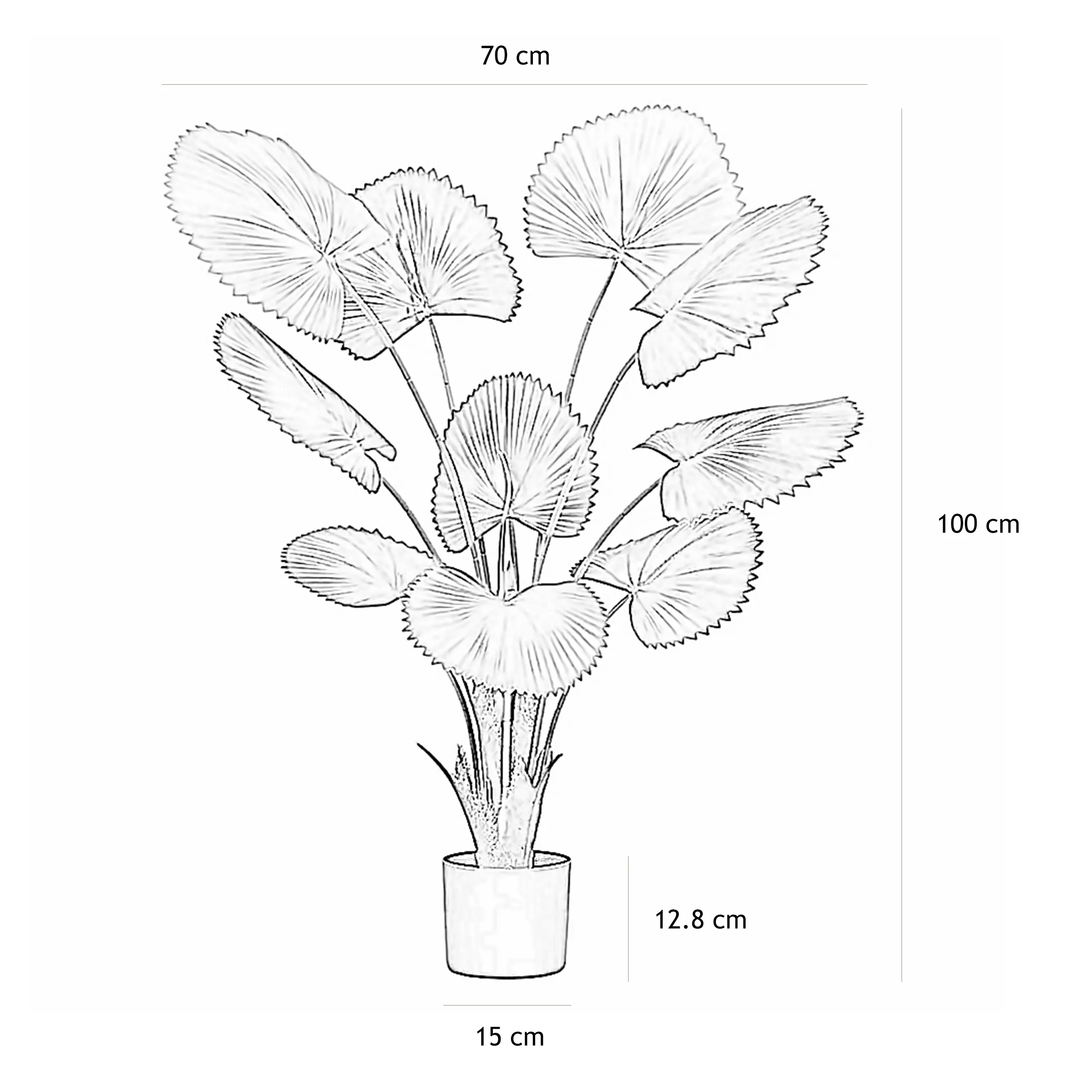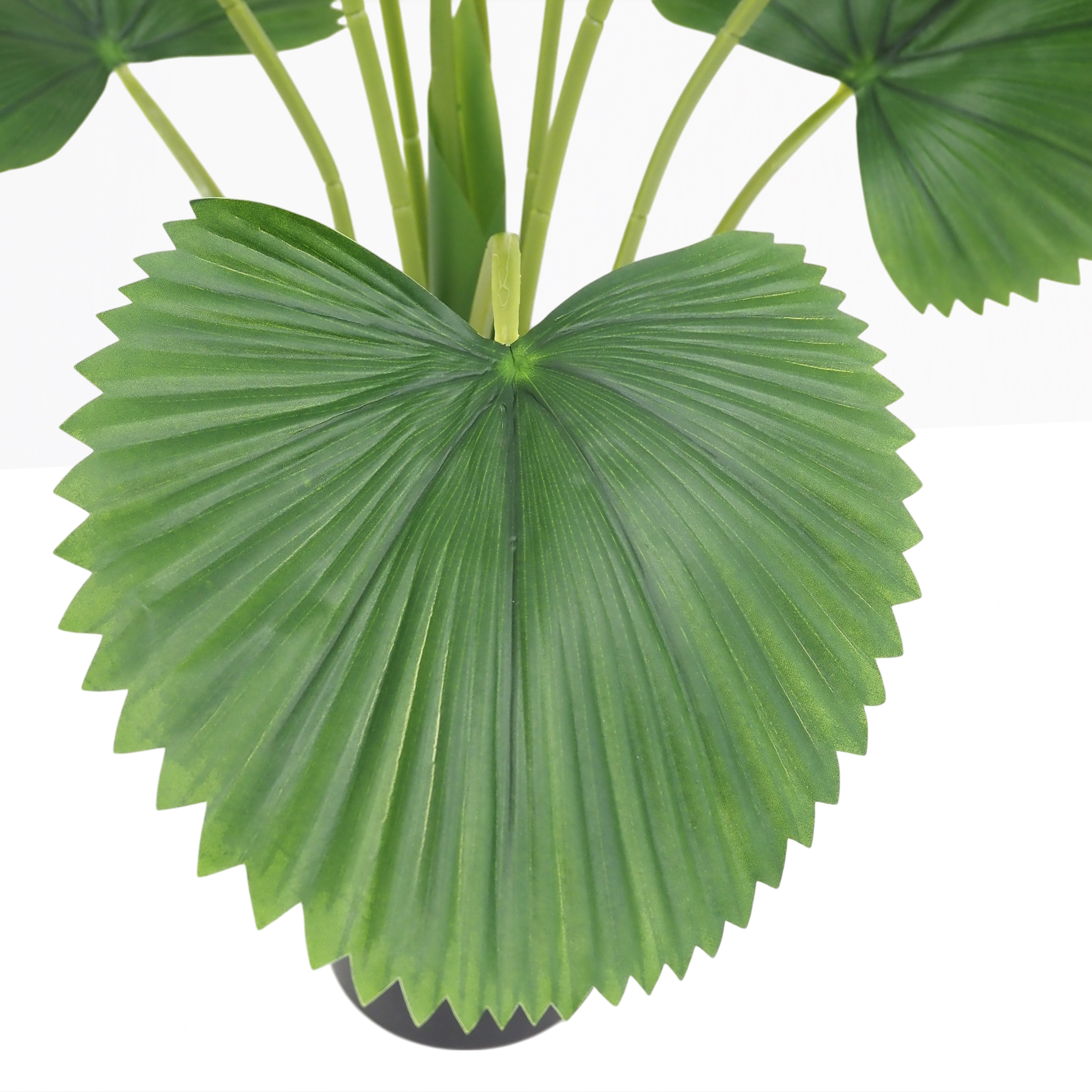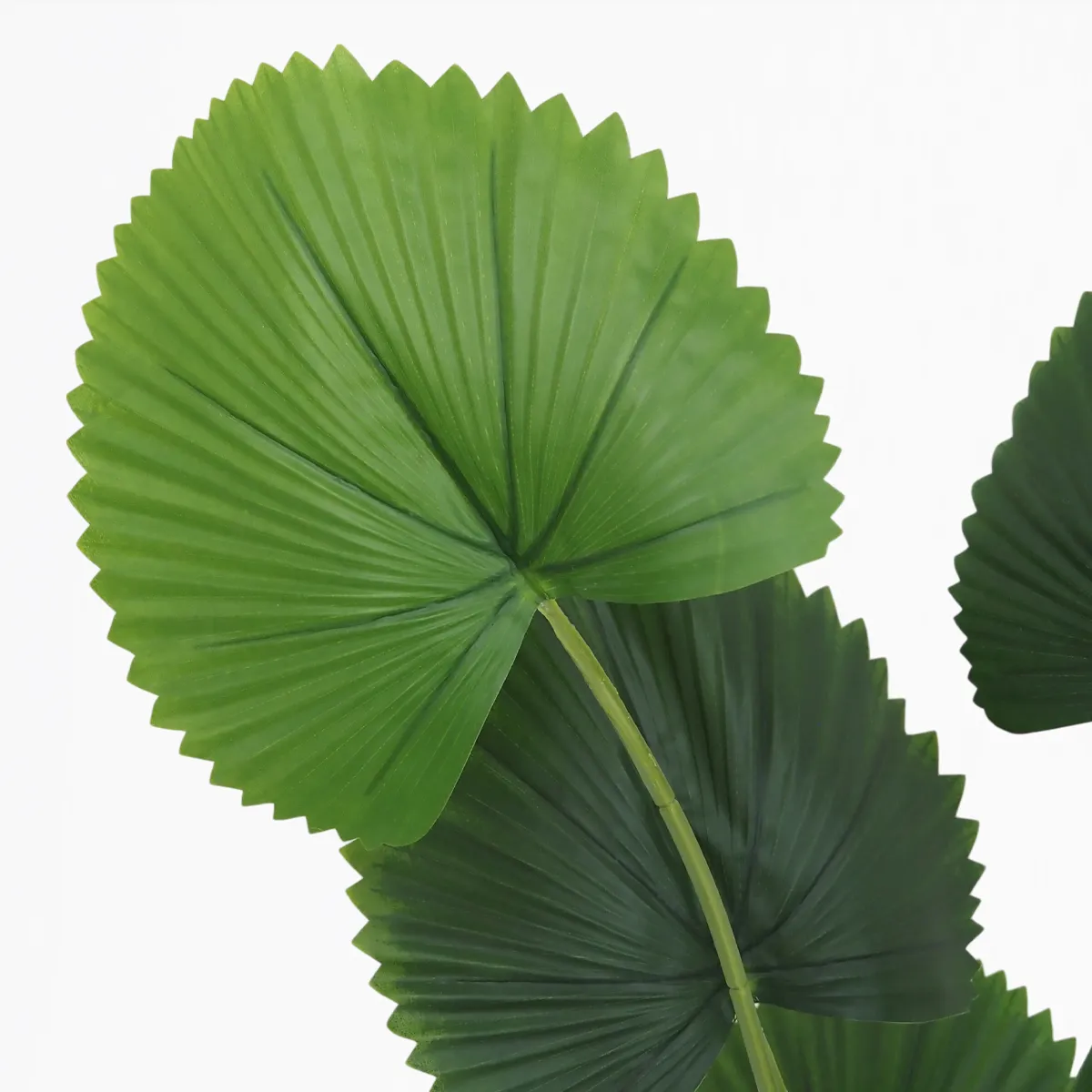 Le licuala, aussi appelé palmier éventail, est une plante prisée pour ses grandes feuilles nervurées et son port graphique. Ce modèle artificiel reprend fidèlement l’allure du véritable palmier. Chaque palme large et nervurée est reproduite avec soin pour un réalisme bluffant. Le résultat est naturel, chic et visuellement apaisant.