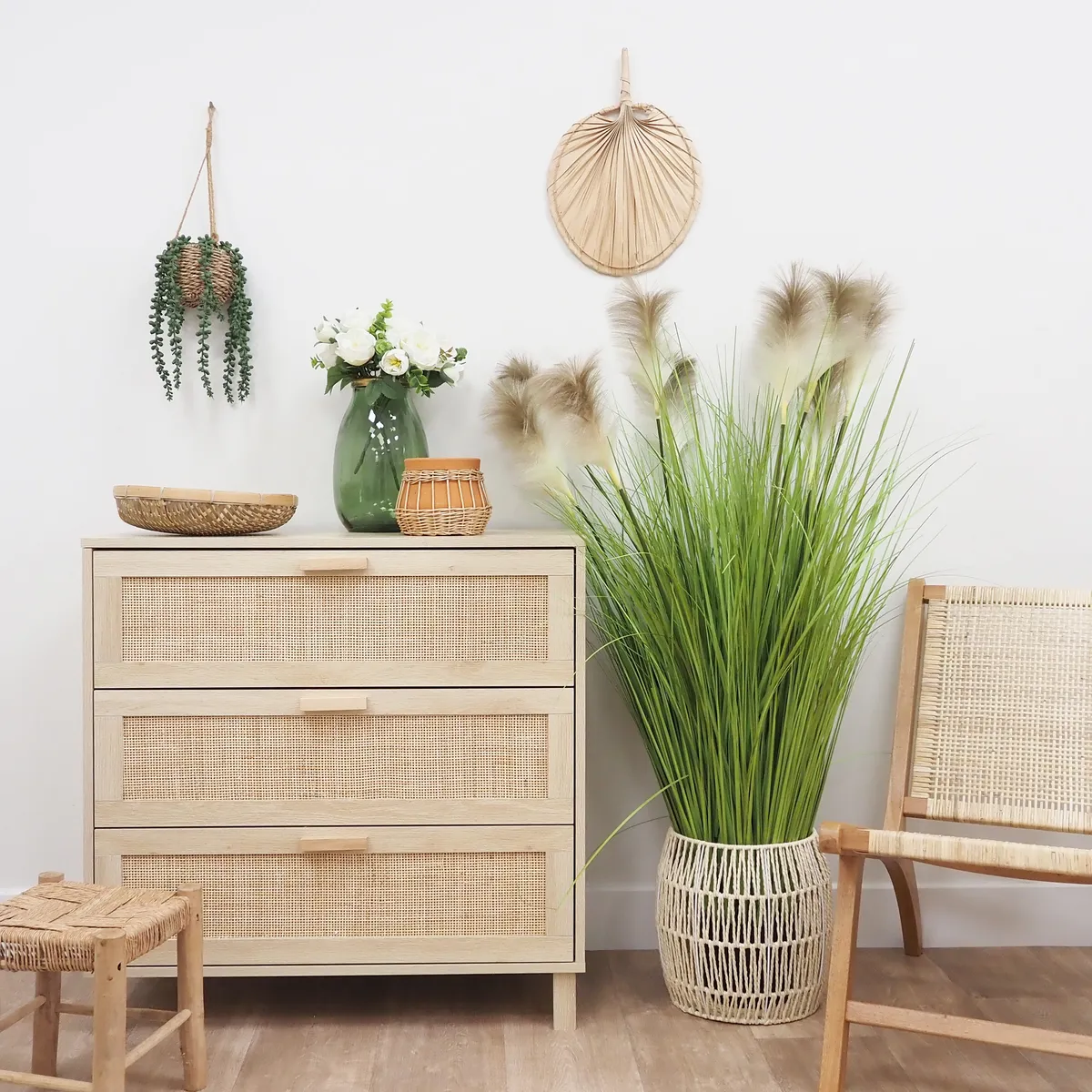Son pot en osier avec finition en petits cailloux complète parfaitement l’illusion, créant un effet naturel authentique qui saura tromper l’œil.